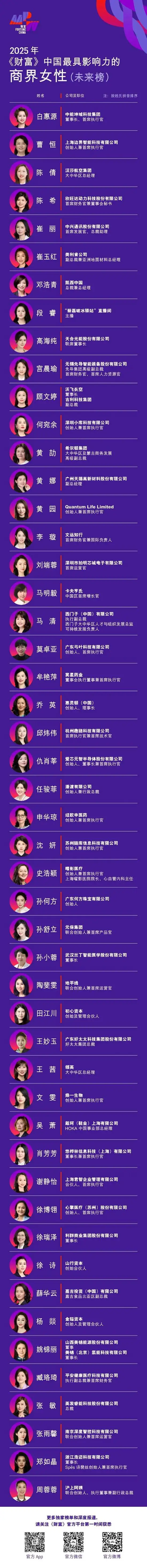 2025年《财富》中国最具影响力的商界女性榜单发布