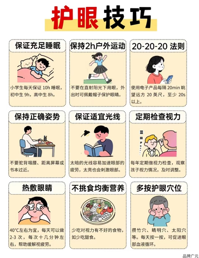 1.科学用眼:遵循“20-20-20”法则——每用眼20分钟,看20英尺(约6米)外的物体20秒,放松睫状肌。
